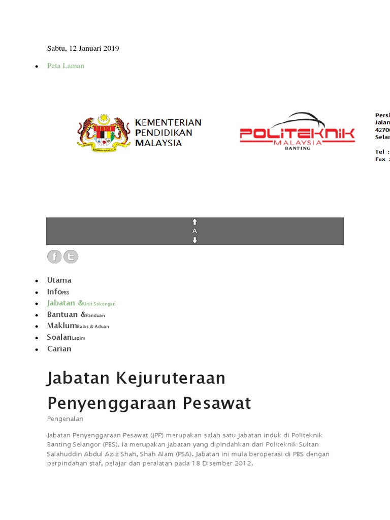 Jabatan Penyenggaraan Pesawat Jpp Pbs Politeknik Banting Selangor Persiaran Ilmu Jalan Sultan Abdul Samad Banting 2020